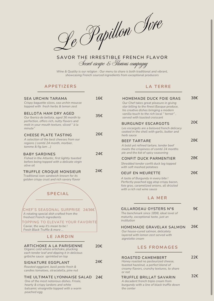 Bienvenue au PAPILLON IVRE, votre néo-brasserie française et bar à vin, ouvert depuis 2017 par Julie Campion. Découvrez un univers intime dédié à la cuisine française, où l’authenticité des plats faits maison se marie avec un menu de partage convivial.